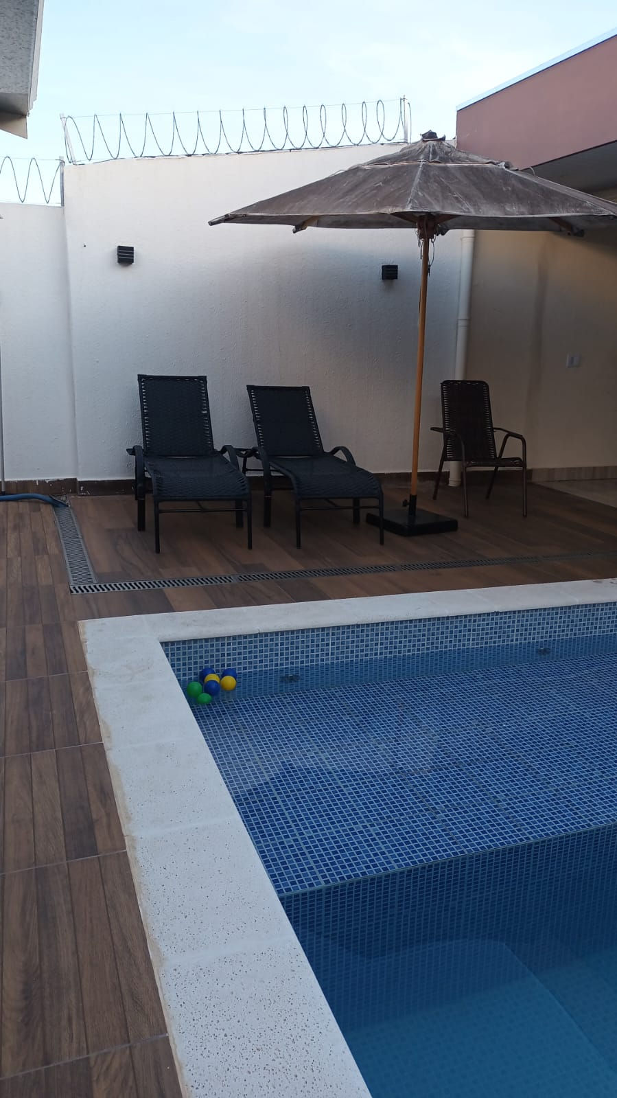 Garagem, lavabo, sala integrada, cozinha planejada, 03 dormitórios aptos, banheiro social, lavanderia, piscina aquecida.